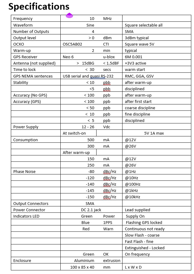 The GPS receiver warm starts in seconds after which the precision 1PPS pulse is used to measure the frequency of the OCXO. After a few minutes delay for warm-up, the EEPROM stored is applied to set the OCXO to frequency. The frequency is then measured over 30 second intervals and, if necessary, corrections applied to correct the accuracy. After the initial warmup time, the frequency is measured over longer periods and fine corrections applied, if required. These small corrections will not affect the performance of digital protocols.