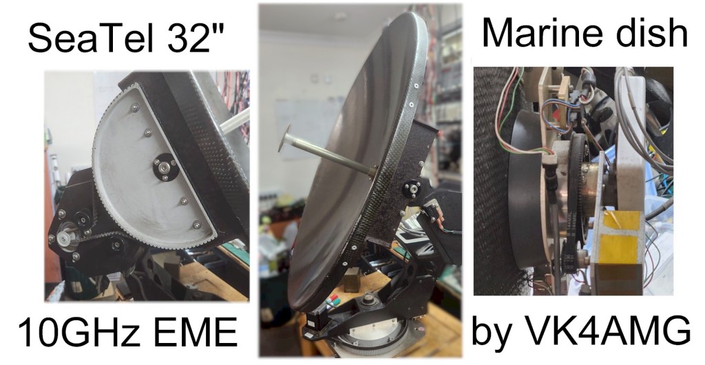 A surplus SeaTel Marine Satellite TV system became available locally. The carbon fibre 32” dish was setup for Ku band satellite operation on a ship or yachts, LNB with circular waveguide to Cassegrain reflector, solid state gyros for roll and pitch correction, signal strength metering for tracking, and motor control. The dish is fitted with stepper motors, well-engineered belt drives and pivots, and limit switches for azimuth, elevation, and polarization control.