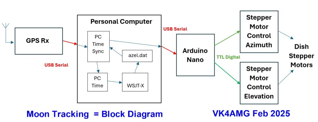 After investigating alternatives for moon tracking, a system (see block diagram below) to steer the stepper motors and rotators for the three EME bands was developed. The system uses the WSJT azel.dat tracking data and passes tracking commands via the GPS disciplined 10MHz reference GPSD-2 module (see https://brisbaneradiosociety.net/10-mhz-reference-by-vk4amg/).