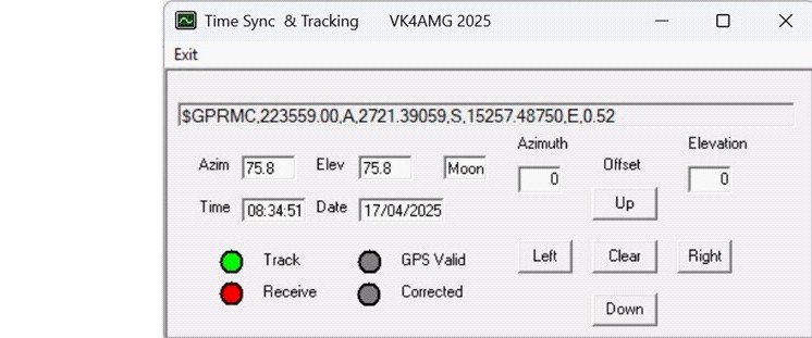 The revised application reads and displays the tracking data from WSJT (C:\WSJT\tracking\azel.dat). Both the moon and sun position may be tracked. Offsets may be applied by scroll bars and push buttons on the GUI. The tracking commands are transmitted by the USB serial port from which the GPS NMEA sentences are received. The GPSD-2 GPS Disciplined 10MHz reference module is revised (hardware only) to pass the tracking commands to the Android Nano processor controlling the stepper motors or rotators. The commands are passed in a format “W az.a el.e <CRLF>” where az.e is a single digit floating point number for azimuth and el.e is a single digit floating point number for elevation. “W 0.0 0.0 <CRLF>” is invalid and forces a stop command. A command less than 10 degrees elevation triggers a park to a position set in the rotator controller processor.