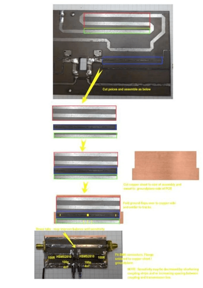 The maximum length of through 50 ohm stripline is determined by the lengths available in the original PCB. The sensitivity of the coupling loop is set by the spacing from the through transmission line and the length of the coupling sections. At lower frequencies / lower powers a coupling track can be placed down each side of the transmission line section.
